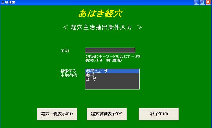 ・参考主治、ユーザ主治のキーワードで抽出して、経穴データ画面を表示します。