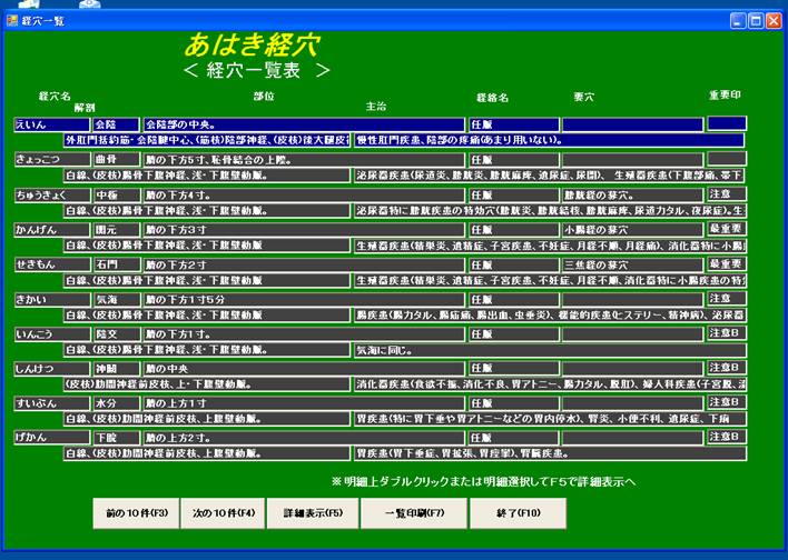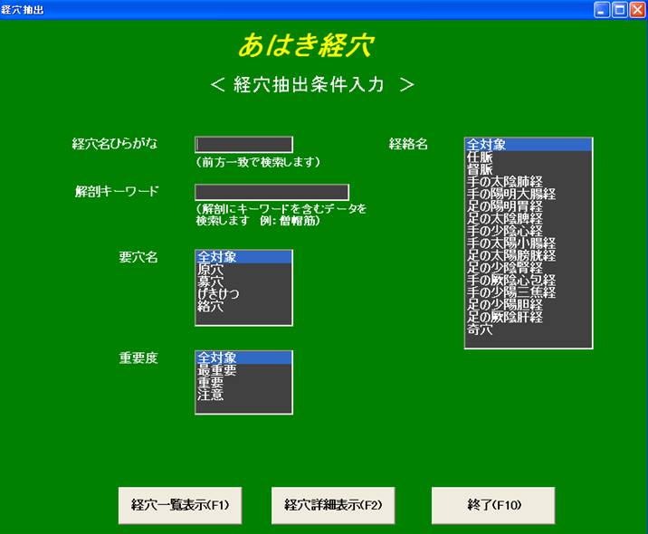 ・経穴名ひらがな、経絡名、解剖キーワード、要穴名で抽出して、経穴データ画面を表示します。